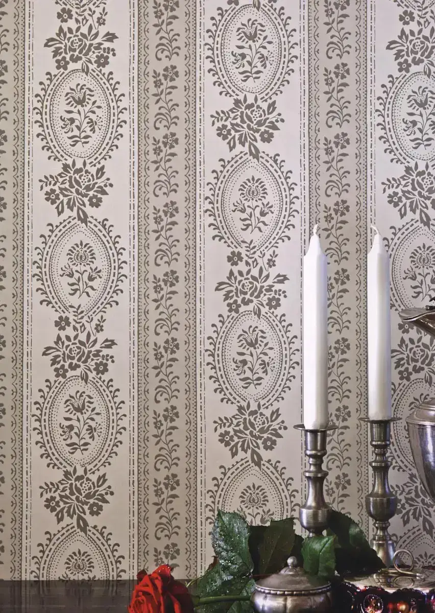 Die Streifen, ca. 7,5 cm breit und mit 10 cm Abstand angeordnet, verleihen Deinen Räumen eine harmonische Struktur. Im Inneren der Streifen verzaubern Blumen und florale Elemente, während die Zwischenräume mit ellipsenförmigen Motiven und weiteren Blumen geschmückt sind. Diese Tapete ist eine wahre Hommage an historische Designs, neu interpretiert für moderne Wohnräume.